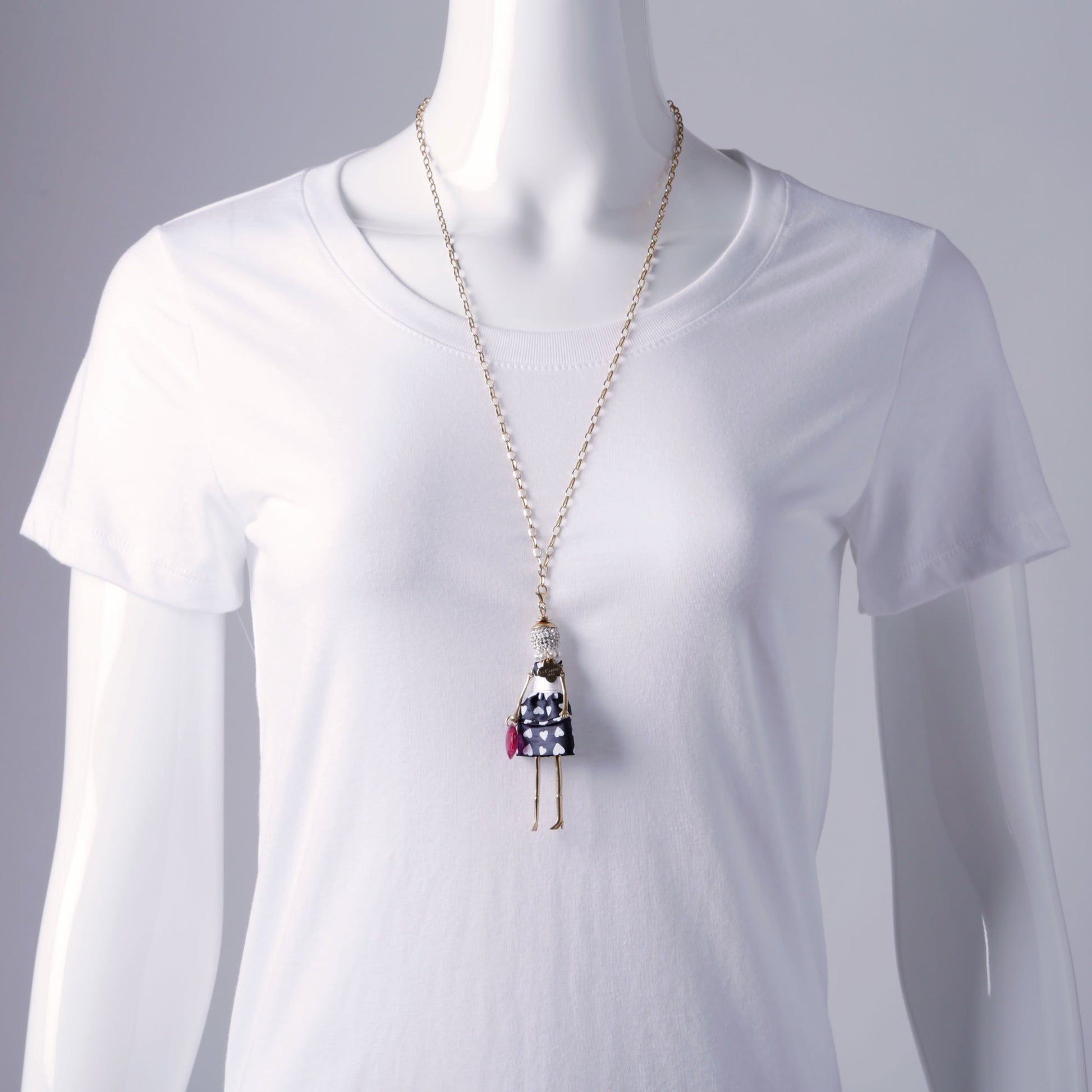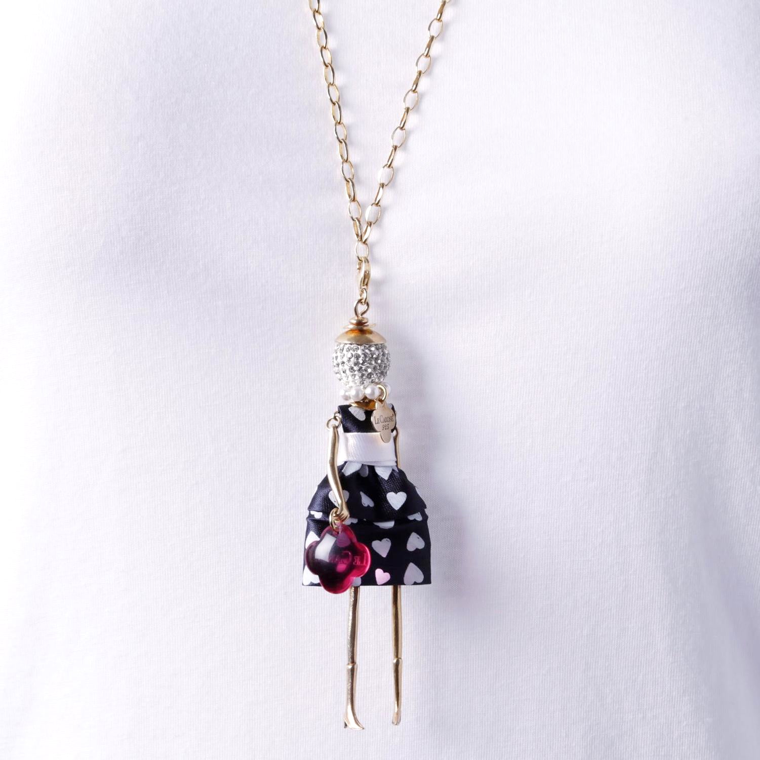 Elegant Le Carose necklace with cute doll with a crystal head wearing a skirt with hearts on it. Holding a pink stone. Silver 925 plated gold with Swaroski